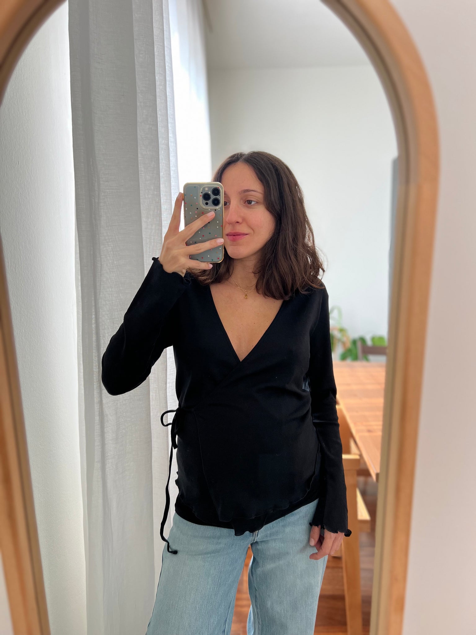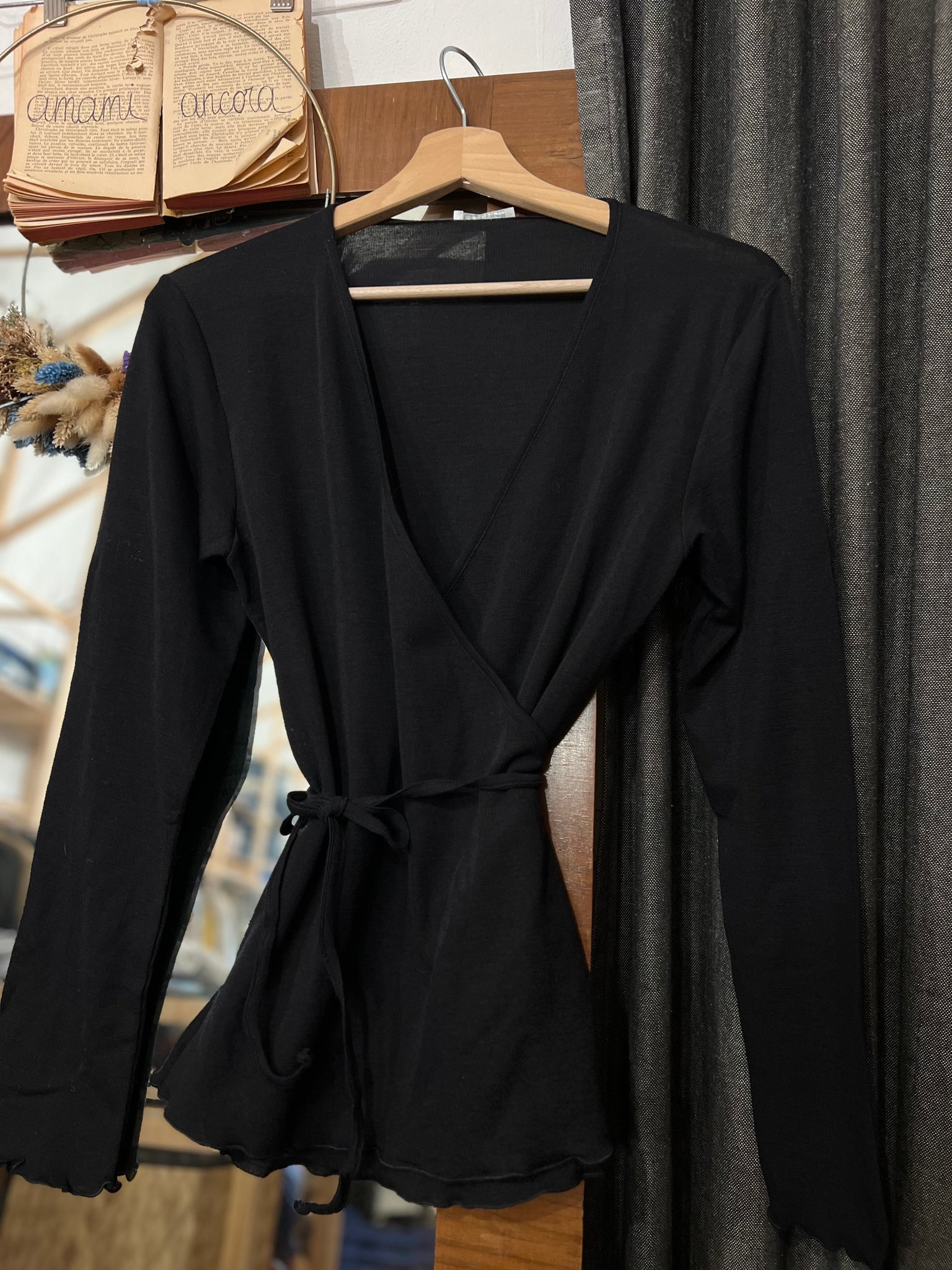 Maglia modello scaldacuore incrociato, si chiude infilando il laccetto nell’asola laterale e legandolo sul lato, davanti o dietro, come si preferisce.