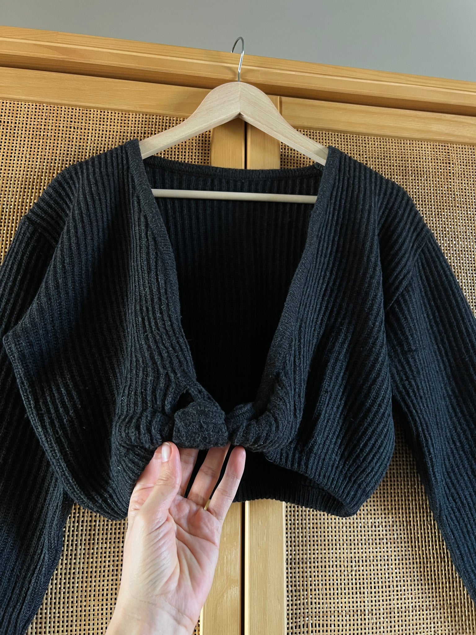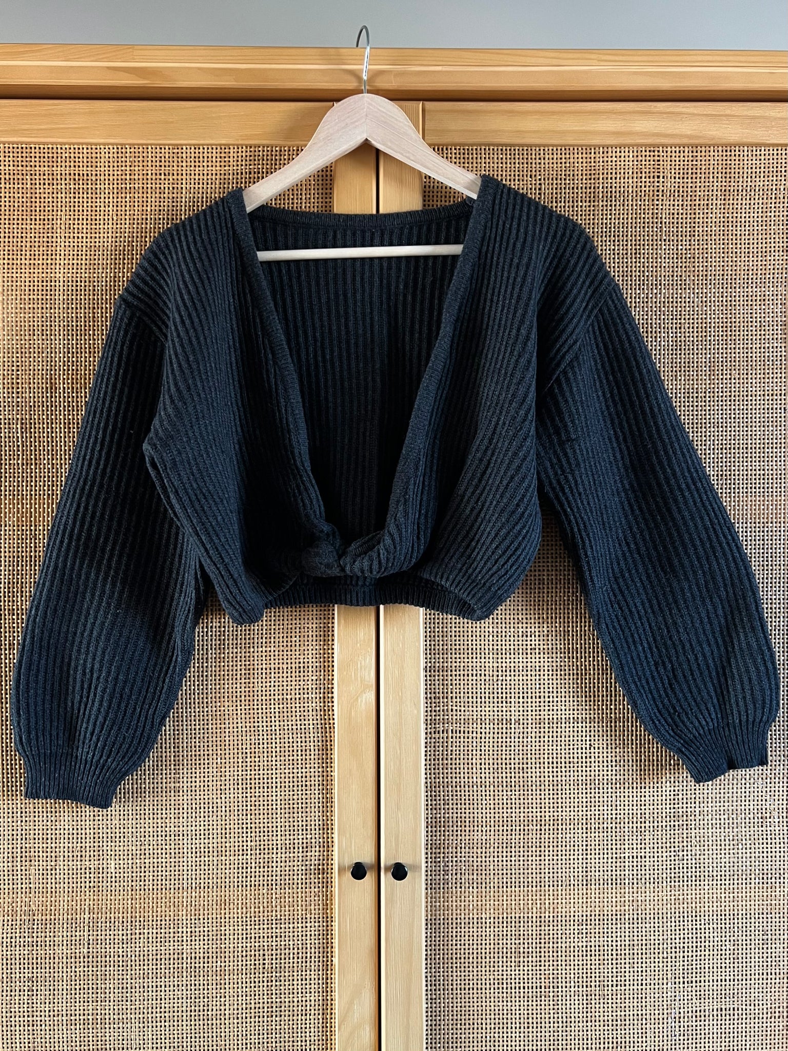 Maglione vintage a coste, modello corto con nodo davanti.
